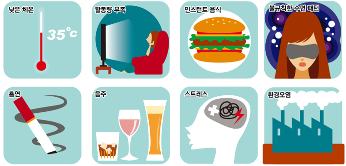 담배는 그 자체만으로도 인체에 초강력 독소로 작용하며, 도를 넘은 음주나 극심한 스트레스 역시 신진 대사에 장애를 일으켜 정상보다 훨씬 많은 부산물을 만들어내는 원인이 되기 때문에 그만큼 독소의 양이 많아지는 셈입니다.