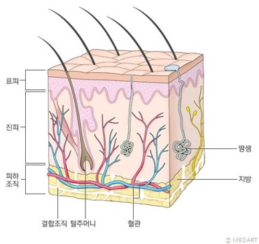 피부는 여러분들이 잘 아시다시피 우리의 장기를 감싸고 있는 껍데기 같은 존재이지만 생명유지를 위해선 껍질이 없으면 하루라도 살 수 없듯이 우리 몸의 생명유지에 중요한 역할을 담당하고 있습니다. 피부의 두께는 1.5 ~ 2.5mm로 매우 얇으며, 가장 얇은 곳은 눈꺼풀, 가장 두꺼운 곳은 손바닥, 발바닥이고 체중의 20%정도의 무게를 차지하고 있습니다. 피부는 크게 표피층과 진피층으로 구분되어 있습니다. 표피층은 피부의 가장 겉면을 감싸고 있는 층으로 외부의 유해한 물질이나 병원균으로부터 보호하고 피부의 유분과 수분이 빠져나가는 것을 막아줍니다. 표피 밑에는 진피층이 있는데 진피층은 표피층의 두께보다 20~40배 가량 두꺼우며 피부의 90% 이상을 형성하고 있습니다. 결합섬유(콜라겐)와 탄력섬유(엘라스틴)으로 구성되어 있으며, 피부의 팽팽함과 탄력을 유지시킵니다.